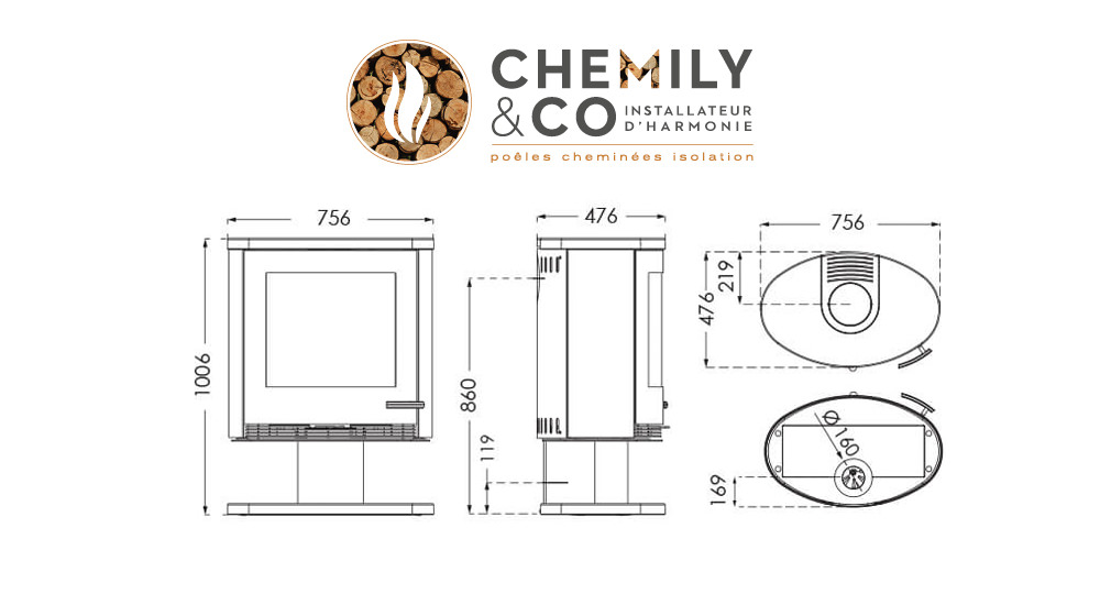 Ce poêle à bois paraît presque suspendu, grâce notamment au pied qui masque l’arrivée intégrée d’air extérieur.